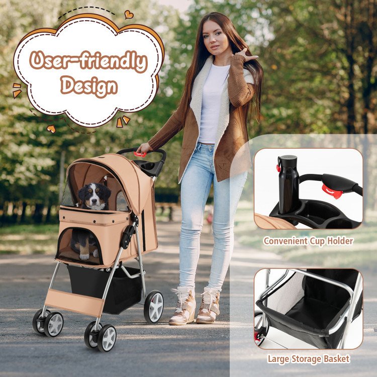 Folding Pet Stroller with Storage Basket and Adjustable Canopy